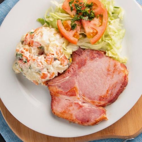 sabrosa chuleta de cerdo ahumada, acompañada de dos